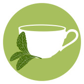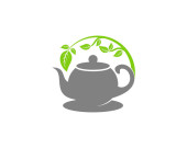 Ziołowe logo kubka zielonej herbaty, logo napoju ziołowego, zielony liść z kubkiem