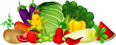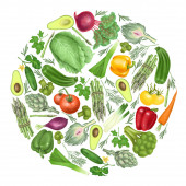 Ilustracja warzyw (pomidor, marchewka, awokado, pieprz, ogórek, karczochy, brokuły, kapusta, szparagi), narysowanych na białym tle