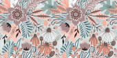 Zdjęcie "Kwiatowy bezszwowy wzór na białym. Streszczenie tła wektora z kwiatami i liśćmi. Naturalny jasny design. Styl skandynawski." może być wykorzystywane do celów osobistych i komercyjnych zgodnie z warunkami zakupionej licencji Royalty-free. Obraz jest dostępny do pobrania w jakości wysokiej rozdzielczości do 5760x3840.