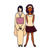 kobiety stojące z różnymi postaciami na białym tle