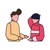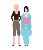 kobiety stojące z różnymi postaciami na białym tle