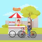 Hot Dog Sprzedawca z jedzeniem i sosami w butelkach