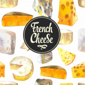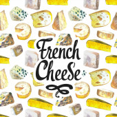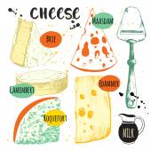 Akwarelowe ilustracje ze szlachetnymi serami: edammer, maasdam. Bar przekąskowy. Produkty mleczarskie. Świeża żywność ekologiczna.