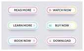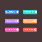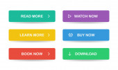 Kolorowe przyciski internetowe. Zestaw przycisków strony, aby przejść do żądanej akcji. Czytaj więcej, dowiedz się więcej, zarezerwuj teraz, obejrzyj teraz, pobierz, kup teraz.