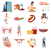 Rynek uliczny. Targi na świeżym powietrzu, namioty z jedzeniem, produktami, kawą i kwiatami. Postacie kupują i sprzedają na targach ulicznych, zestaw ilustracji wektor ulicy rynkowej. Kioski szybkiej obsługi, wózek z lodami