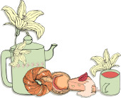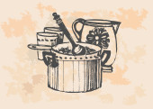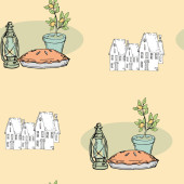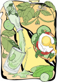 akwarela ilustracja konewki, ptak i kwiat w zieleni na żółtym tle.
