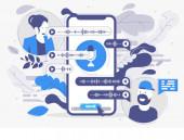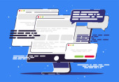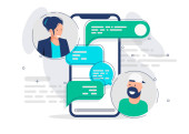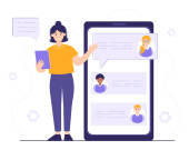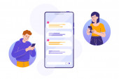 Dziewczyna trzyma smartfona w ręku, komunikuje się w posłańcu, szablon ekranu dla wiadomości błyskawicznych