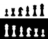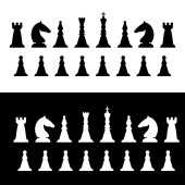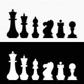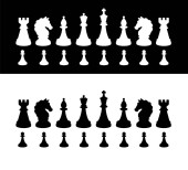 Szachy wektorowe odizolowane na białym tle. Gram w szachy w zarządzie. Sylwetki figur szachowych. Ikony szachowe. Król, królowa, wieża, rycerz, goniec, pionek
