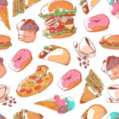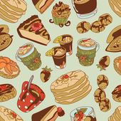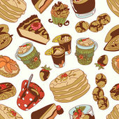 Zdjęcie "Druk herbaty: czajniczek, filiżanka herbaty, ciastka: ciasteczka, ciasto. Czekoladowe cukierki. Jagody róży i liście herbaty. Gotowe. Płynny wzór wektora (tło). Ozdoba kreskówkowa." może być wykorzystywane do celów osobistych i komercyjnych zgodnie z warunkami zakupionej licencji Royalty-free. Obraz jest dostępny do pobrania w jakości wysokiej rozdzielczości do 5760x3840.