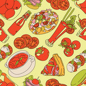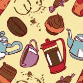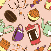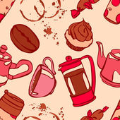 Druk herbaty: czajniczek, filiżanka herbaty, ciastka: ciasteczka, ciasto. Czekoladowe cukierki. Jagody róży i liście herbaty. Gotowe. Płynny wzór wektora (tło). Ozdoba kreskówkowa.