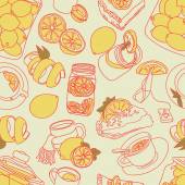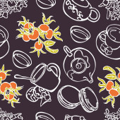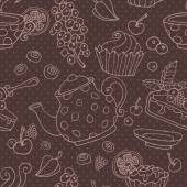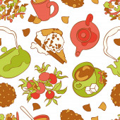 Druk herbaty: czajniczek, filiżanka herbaty, ciastka: ciasteczka, ciasto. Czekoladowe cukierki. Jagody róży i liście herbaty. Gotowe. Płynny wzór wektora (tło). Ozdoba kreskówkowa.