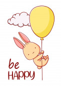 Cute Bunny w balonie z marchewką i chmury kreskówki kawaii dobry dzień płaska ręka narysowane na białym tle