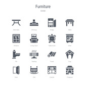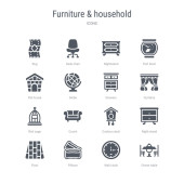 zestaw 16 ikon skoku wektorowego, takich jak kurtyna, łóżeczko dziecięce, drzwi, pies,
