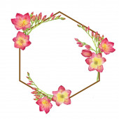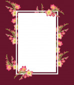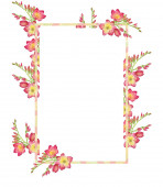 Ilustracja akwarela z zielonymi liśćmi i czerwonym bukietem freesia, gałąź z pączkami .