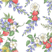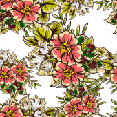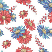 Płynny wzór z ręcznie rysowane kolorowe rumianki, dzwonki i liście na białym tle