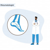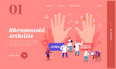 Koncepcja reumatologii strony internetowej. Malutcy reumatolodzy leczą reumatyzm, zapalenie kości i stawów. Zapalenie stawów płaski wektor koncepcyjny na niebieskim tle dla krajowego dnia opieki zdrowotnej