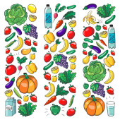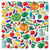 Zdjęcie "Wektor wzór z zdrowej żywności. Owoce i warzywa. Mleko, produkty mleczne. Wzór do sklepu, centrum handlowe, menu, kawiarnia, Restauracje." może być wykorzystywane do celów osobistych i komercyjnych zgodnie z warunkami zakupionej licencji Royalty-free. Obraz jest dostępny do pobrania w jakości wysokiej rozdzielczości do 5760x3840.