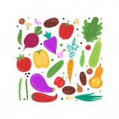Warzywa i owoce wzór. Warzywa kuchenne i owoce ręcznie rysowane doodle zaokrąglony plakat, świeże organiczne opakowanie wegetariańskie, zdrowy styl życia wektor kolorowe tło
