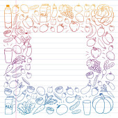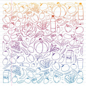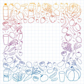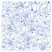 Wektor wzór z zdrowej żywności. Owoce i warzywa. Mleko, produkty mleczne. Wzór do sklepu, centrum handlowe, menu, kawiarnia, Restauracje.