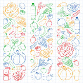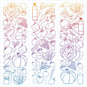Zdjęcie "Wektor wzór z zdrowej żywności. Owoce i warzywa. Mleko, produkty mleczne. Wzór do sklepu, centrum handlowe, menu, kawiarnia, Restauracje." może być wykorzystywane do celów osobistych i komercyjnych zgodnie z warunkami zakupionej licencji Royalty-free. Obraz jest dostępny do pobrania w jakości wysokiej rozdzielczości do 5760x3840.