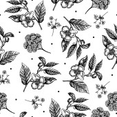 Dekoracyjne bezszwowe piekarnia Herbata owocowa. Kwiaty, pąki, owoce, liście, gałęzie. Ilustracja wektora. Ręczna grafika. Nadaje się do dekoracji różnych powierzchni.