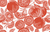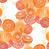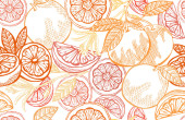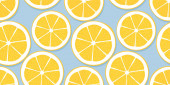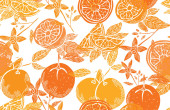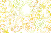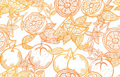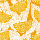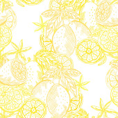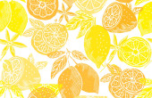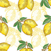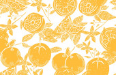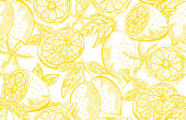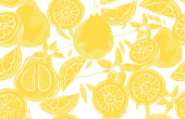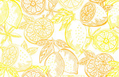 Elegancki bezszwowy wzór z cytrynowymi owocami, elementami designu. Wzór owoców na zaproszenia, karty, nadruk, opakowanie upominkowe, produkcja, tekstylia, tkaniny, tapety. Jedzenie, kuchnia, motyw wegetariański