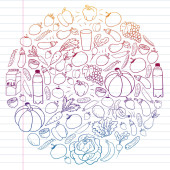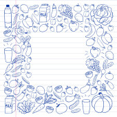 Wektor wzór z zdrowej żywności. Owoce i warzywa. Mleko, produkty mleczne. Wzór do sklepu, centrum handlowe, menu, kawiarnia, Restauracje.