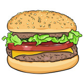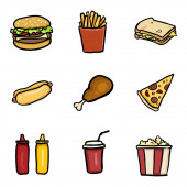 wektor kreskówka fast foody kombi - hamburger, frytki, napoje gazowane