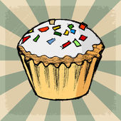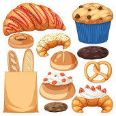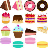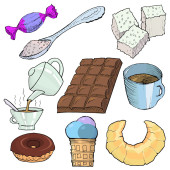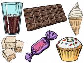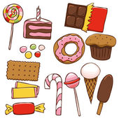 Cukierki, lizak, tabliczka czekolady, bułka w szkliwie, pączek, ciasto, babeczka. Zestaw słodyczy. Odizolowany na biało. Szkice, ręcznie rysowane, ilustracja wektora