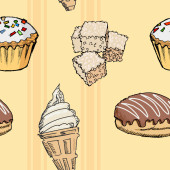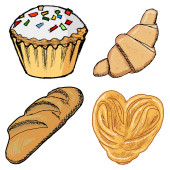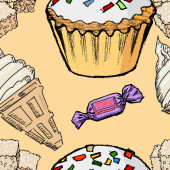 Zdjęcie "Cukierki, lizak, tabliczka czekolady, bułka w szkliwie, pączek, ciasto, babeczka. Zestaw słodyczy. Odizolowany na biało. Szkice, ręcznie rysowane, ilustracja wektora" może być wykorzystywane do celów osobistych i komercyjnych zgodnie z warunkami zakupionej licencji Royalty-free. Obraz jest dostępny do pobrania w jakości wysokiej rozdzielczości do 5760x3840.