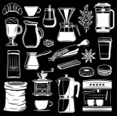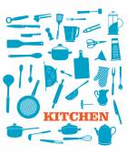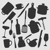 Przybory kuchenne, naczynia kuchenne, czarne sylwetki, artykuły gospodarstwa domowego. Wektor domu naczynia kucharskie i rondel, chochla, filiżanka, widelec i nóż, trzepaczka, łyżka i deska do cięcia, tokarka