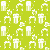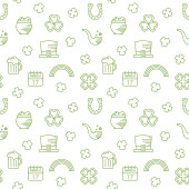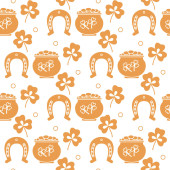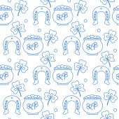 Płynny wzór z liśćmi koniczyny, garnkiem złota, podkową. Dzień św. Patryka. Wakacyjna przeszłość. Irlandzki wzór wektora. Projekt banera, plakatu, tekstyliów, nadruku.