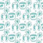 Zdjęcie "Płynny wzór z liśćmi koniczyny, garnkiem złota, podkową. Dzień św. Patryka. Wakacyjna przeszłość. Irlandzki wzór wektora. Projekt banera, plakatu, tekstyliów, nadruku." może być wykorzystywane do celów osobistych i komercyjnych zgodnie z warunkami zakupionej licencji Royalty-free. Obraz jest dostępny do pobrania w jakości wysokiej rozdzielczości do 5760x3840.