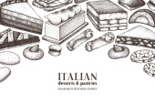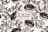 Włoski sztandar piekarniczy. Z ręcznie rysowane desery, ciasta, ciasteczka szkic ilustracji. Elementy projektu menu pieczenia. Tradycyjne włoskie słodycze tło