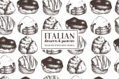 Zdjęcie "Włoski sztandar piekarniczy. Z ręcznie rysowane desery, ciasta, ciasteczka szkic ilustracji. Elementy projektu menu pieczenia. Tradycyjne włoskie słodycze tło" może być wykorzystywane do celów osobistych i komercyjnych zgodnie z warunkami zakupionej licencji Royalty-free. Obraz jest dostępny do pobrania w jakości wysokiej rozdzielczości do 5760x3840.