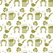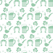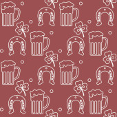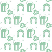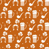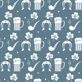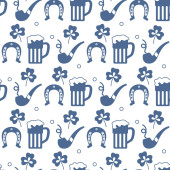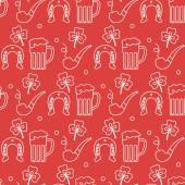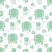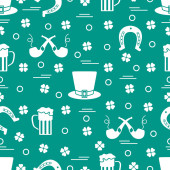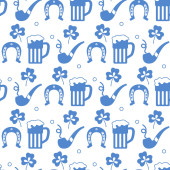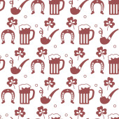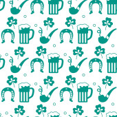 Płynny wzór z liśćmi koniczyny, kubek piwa, podkowa, fajka do palenia. Dzień św. Patryka. Wakacyjna przeszłość. Irlandzki wzór wektora. Projekt banera, plakatu, tekstyliów, nadruku.