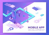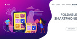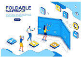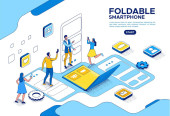 Składana koncepcja izometryczna telefonu z osobami korzystającymi z elastycznego smartfona, postacie z kreskówek z futurystycznymi gadżetami, kompozycja niebiesko-żółta, ilustracja wektora 3D