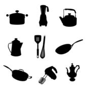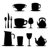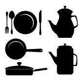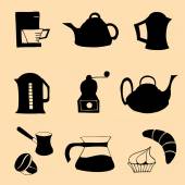 śniadanie ikony ustaw, czarno na białym tle wektor sylwetki jedzenie, picie i ceramiki