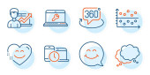 Startup, Ochronę twarzy i poprawne znaki checkbox. Trzymaj serce, uśmiech i ludzie gadający ikony ustawione. Polowanie na głowy, symbole schematów ustawień. Pielęgnacja, opinie na laptopie. Ludzie gotowi. Wektor