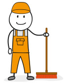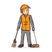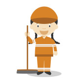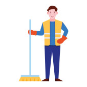Cute wektor kreskówek ilustracja zamiatarka z maską chirurgiczną i rękawice lateksowe jako ochrona przed stanem zagrożenia zdrowia