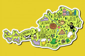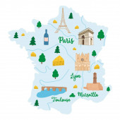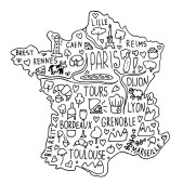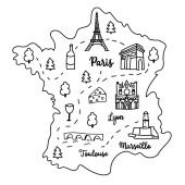 Kolorowe ręcznie rysowane doodle Francja mapa. nazwy miast liternictwo i kreskówki