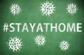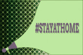 Zostań w domu slogan z nogami w buty do biegania na progu przy wyjściu z domu przed trawnikiem. Kampania lub środek ochrony przed koronawirusem, COVID 19. Zostań w domu cytat tekst, hash tag lub hashtag.