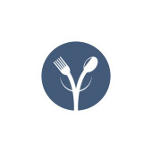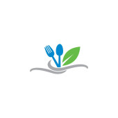 Projekt logo zdrowej żywności. Logo żywności ekologicznej. Logo żywności z łyżką, widelcem i liśćmi. Logo jedzenia. Sztućce liściaste zdrowa żywność Logo