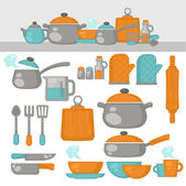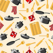 Patelnia do grillowania, rękawice ochronne tekstylne, filiżanka i patelnia bezszwowy wzór naczyń. Solniczka ze szpatułką i łyżką, kulinarne instrumenty do przygotowywania potraw. Wektor rondla płaski