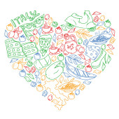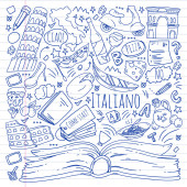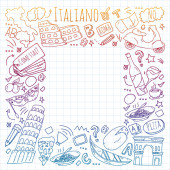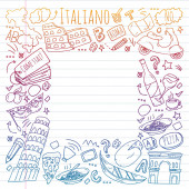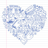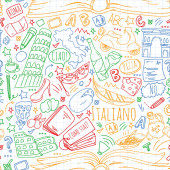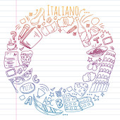 Nauka języka włoskiego. Wzór wektorowy z ikonami i symbolami narodowymi Włoch.