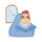 Zostań w domu, dziewczyna siedzi na krześle z książkami na kreskówce
