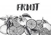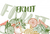 Stylizowane owoce z jagodami i zielonymi gałęziami Vector Set. Jasne i soczyste letnie sezonowe odżywianie z granatem i pomarańczą