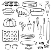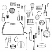 Ręcznie rysowane kocie rzeczy. Zabawki, jedzenie i akcesoria do pielęgnacji zwierząt. Ilustracja szkicu wektora.