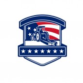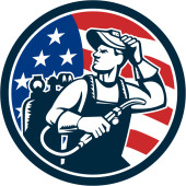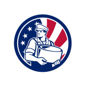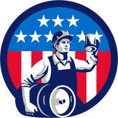 Ilustracja amerykańskiego rolnika ekologicznego w kapeluszu i kombinezonie ramiona złożone patrząc w bok z gwiazdami USA i paski flaga ustawiona wewnątrz koła wykonane w stylu retro.