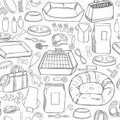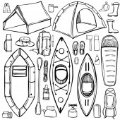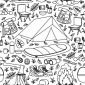 Ręcznie rysowane przedmioty kempingowe zestaw. Plecak podróżny z ocalałymi rzeczami i innymi rzeczami na kemping. Wektor bezszwowy wzór